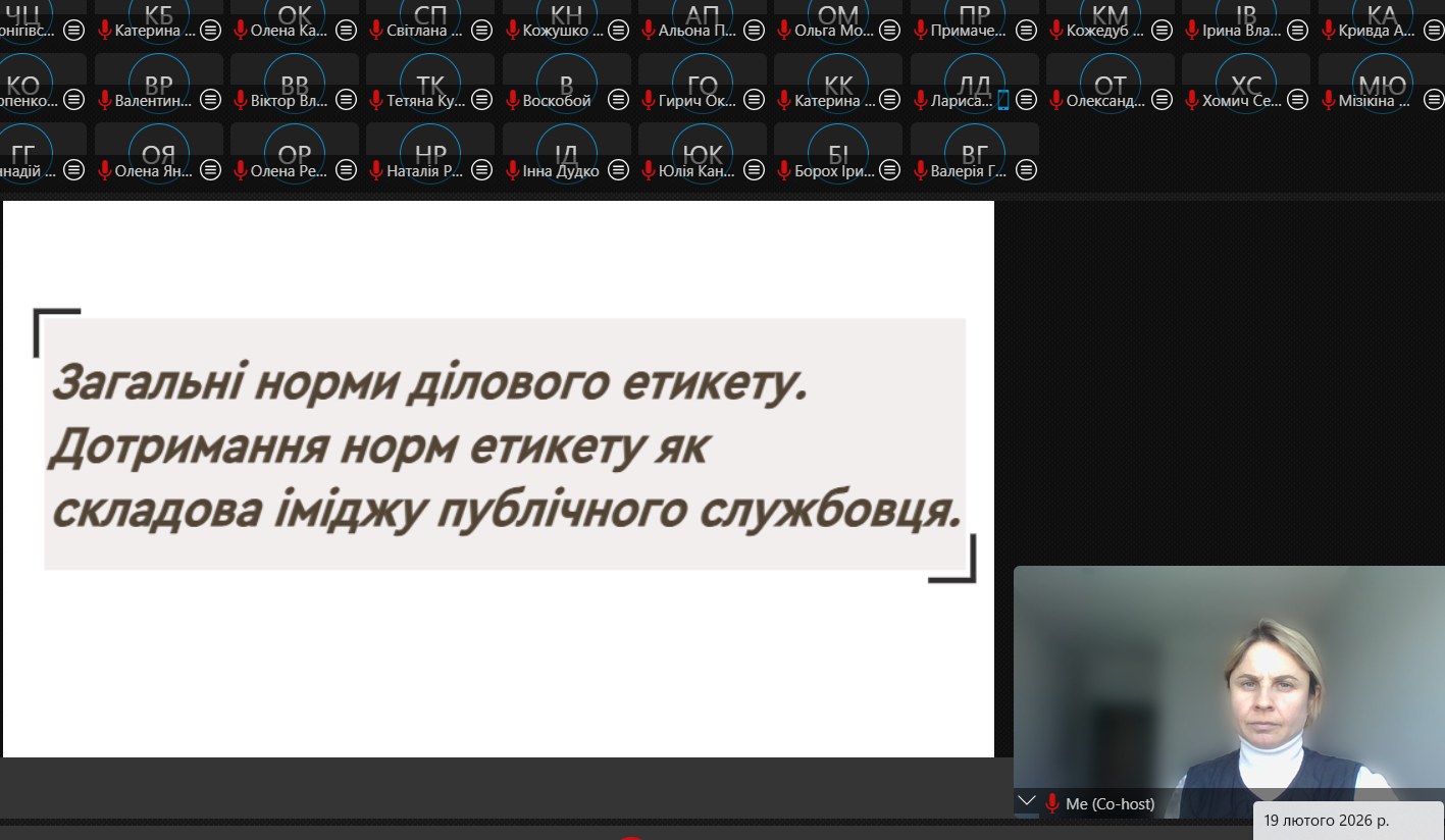 Протягом двох днів у дистанційному форматі слухачі працювали над осмисленням ролі протоколу й етикету як інструментів формування довіри до органів влади. Навчання стало простором не лише для систематизації знань, а й для критичного переосмислення усталених підходів до ділової комунікації в публічному секторі.