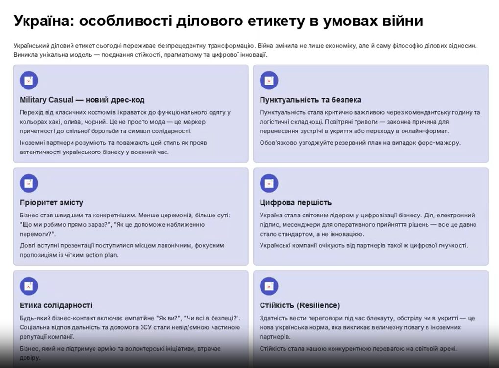 Окремий акцент було зроблено на етикеті налагодження та підтримки контактів із міжнародними партнерами. Учасники розглянули міжкультурні відмінності, принципи дипломатичної коректності, особливості комунікації з представниками різних країн та інституцій.